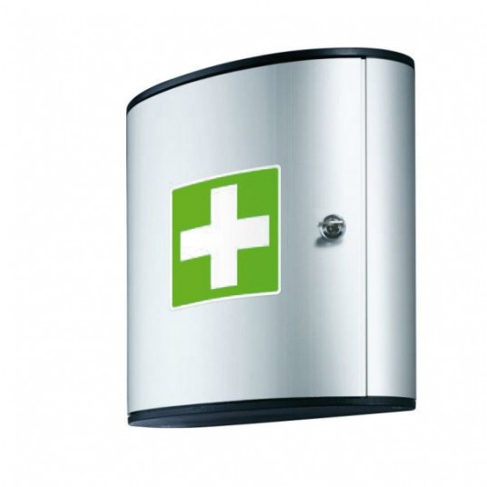 - wykonana z matowego aluminium - dwie wysuwane obrotowo szufladki - miejsce na umieszczenie informacji z zawartością apteczki - zamykana na zamek - w komplecie 2 klucze