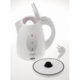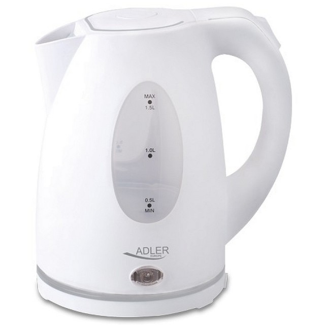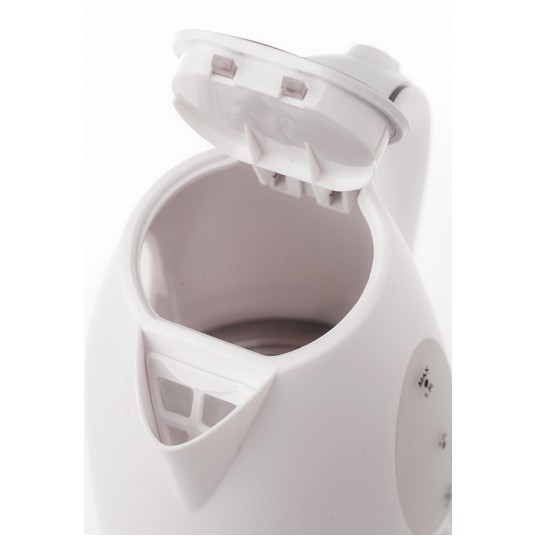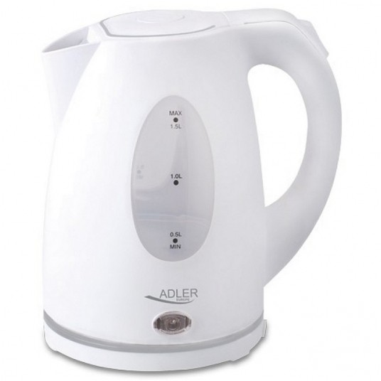 Duży, elektryczny czajnik rodzinny, moc 2000W, pojemność max. 1,5 l, pojemność min. 0,5 l, obrotowa podstawa i płaskie dno, nowowczesne wzornictwo, wskaźnik poziomu wody z podziałką, filtr zatrzymujący osady wapnia, grzałka ze stali szlachetnej, automatyczne wyłączanie po zagotowaniu wody, lampka kontrolna, rok gwarancji