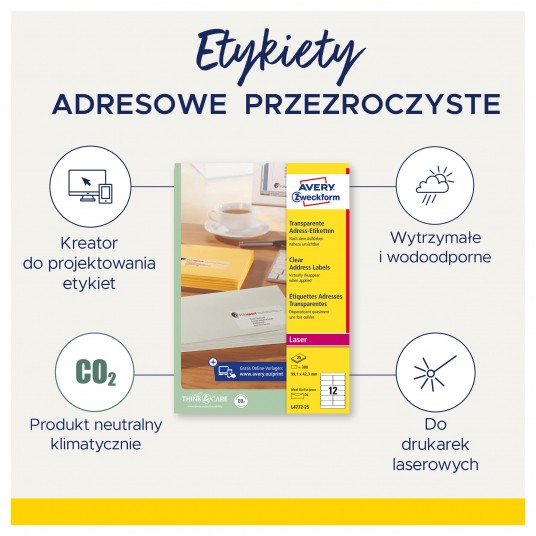 Przezroczyste etykiety adresowe na listy i koperty• Idealne do eleganckiego adresowania kopert i listów. Etykiety są dostępne w wielu wymiarach dopasowanych do popularnych formatów kopert.