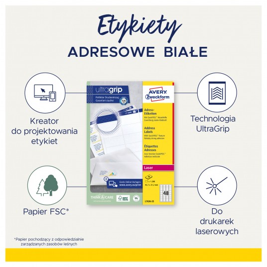 • Produkcja etykiet Avery Zweckform jest neutralna pod względem emisji CO2 (certyfikat Focus Future) i zgodna ze standardem ISO14001, który pomaga zminimalizować negatywne czynniki oddziałujące na środowisko naturalne.