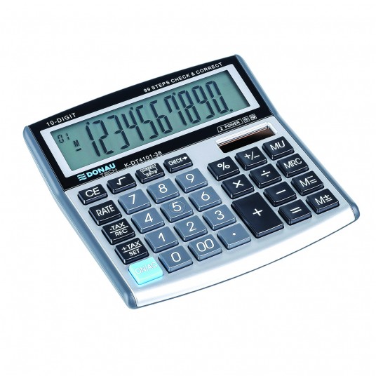 - kalkulator z 10-cyfrowym wyświetlaczem z zasilaniem bateryjno-solarnym - wymiary: 136 x 134 x 28 mm - posiada funkcję pierwiastka kwadratowego oraz obliczania procentów, obliczanie marży MU, obliczenia podatkowe TAX+ TAX- , sprawdź i popraw CHECK & CORRECT, podwójne zero - możliwość kasowania ostatniej pozycji, pamięć - wyłącza się automatycznie - 5 lat gwarancji - kolor srebrny