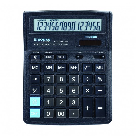 - kalkulator z 16-cyfrowym wyświetlaczem z zasilaniem bateryjno-solarnym - wymiary: 142 x 193 x 39 mm - posiada funkcję pierwiastka kwadratowego oraz obliczania procentów, obliczanie marży MU, podwójne zero, kasowanie ostatniej pozycji, pamięć, ustawienie dziesiętne, zaokrąglanie wyniku, konwersja walut - wyłącza się automatycznie - 5 lat gwarancji - kolor czarny