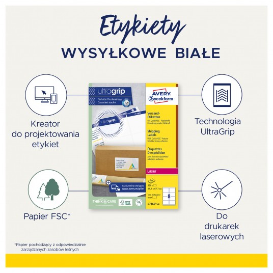 • Białe, kryjące etykiety wysyłkowe BlockOut™ całkowicie zakrywają stare etykiety i opisy. • Pozwalają na ponowne wykorzystanie paczek i dużych kopert - oszczędność pieniędzy oraz ochrona środowiska. • Bezpieczeństwo zadruku dla drukarek laserowych przetestowane i zatwierdzone przez TUV. • Ekologiczne etykiety z certyfikatem FSC, podlegające pełnej utylizacji jako odpad papierowy. • Posiadają unikalny system QuickPEEL™ ułatwiający odrywanie i szybsze przyklejanie etykiet. • Przeznaczone do drukarek laserowych. • Darmowe i łatwe w użyciu szablony oraz oprogramowanie do projektowania etykiet dostępne na