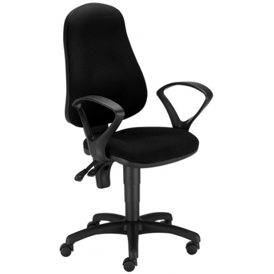 Krzesło biurowe obrotowe z tapicerowanym siedziskiem i oparciem oraz stałymi podłokietnikami.