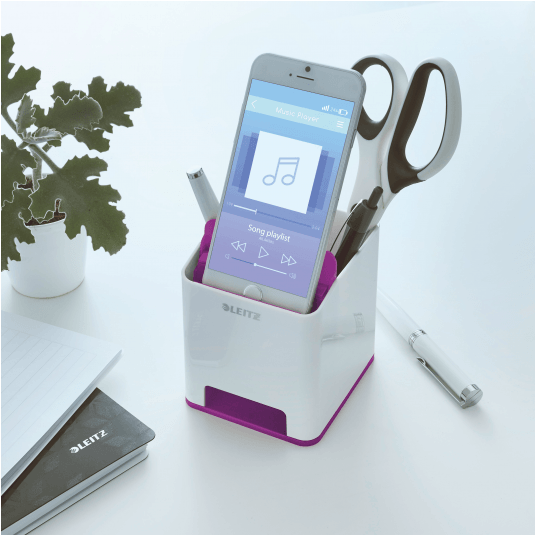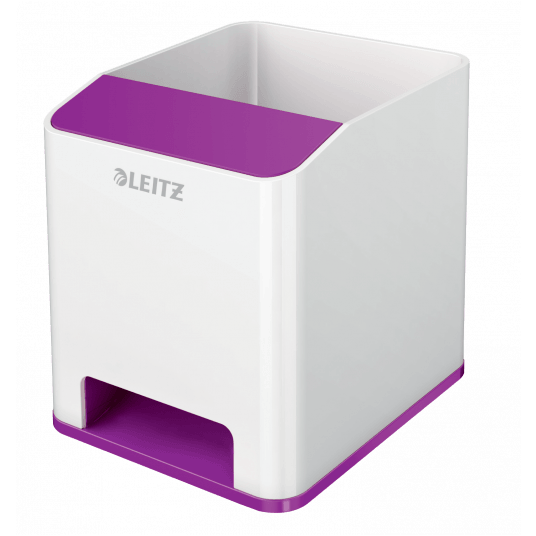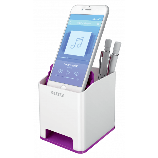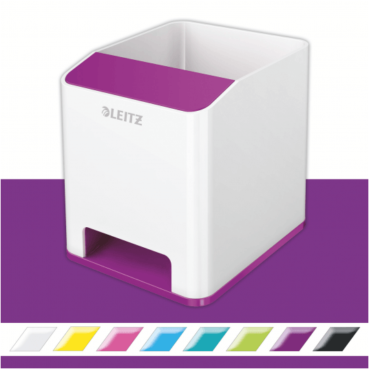 Przykuwający wzrok, wysokiej jakości stylowy kubek na długopisy ze wzmacniaczem dźwięku, w unikalnym zestawieniu 2 kolorów, wykończony z połyskiem.