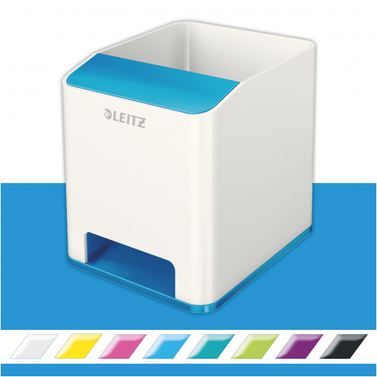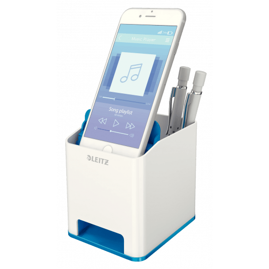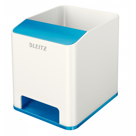 Przykuwający wzrok, wysokiej jakości stylowy kubek na długopisy ze wzmacniaczem dźwięku, w unikalnym zestawieniu 2 kolorów, wykończony z połyskiem.