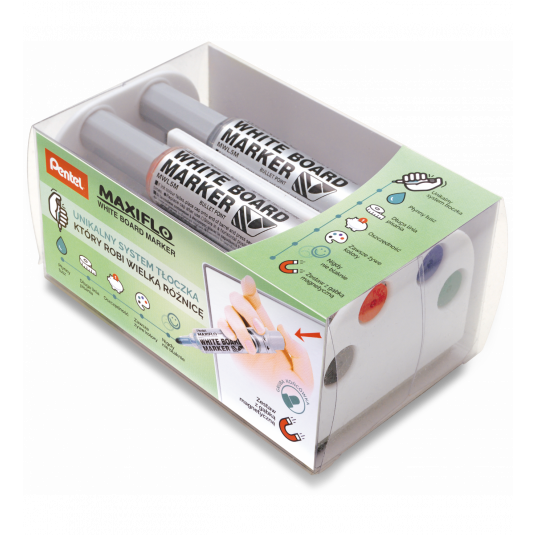 - Zestaw MWL5M-4N zawiera 4 markery (czarny, czerwony, niebieski, zielony) oraz gąbkę magnetyczną.