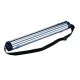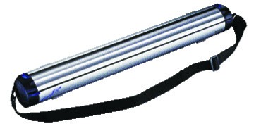 Aluminiowa tuba, wyposażona w regulowane uchwyty, które pozwalają na jej zawieszenie w różnych miejscach, i pasek ułatwiający przenoszenie.