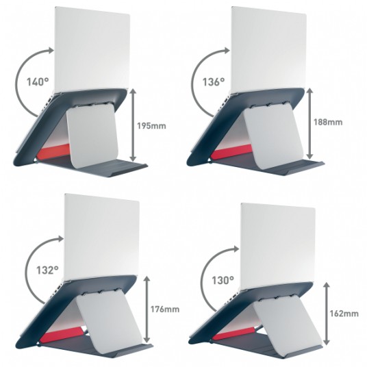 - elementy gumowe i zintegrowany uchwyt zapewniają bezpieczne i stabilne umieszczenie laptopa na podstawce, zapobiegają jego przesuwaniu