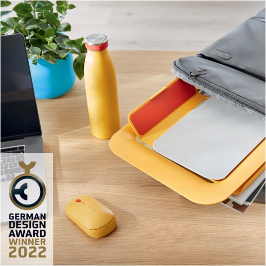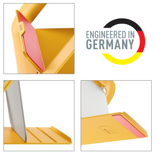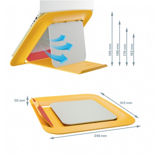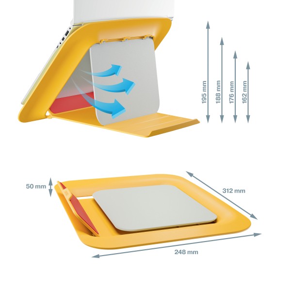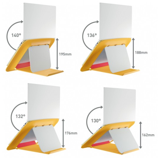 Podstawka Leitz Ergo Cosy umożliwia podniesienie laptopa na optymalną dla oczu wysokość, zapewniając wygodny kąt patrzenia na ekran oraz korygując postawę w czasie pracy.