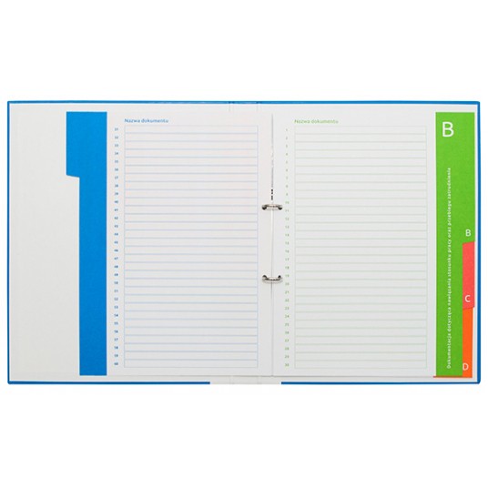 - wykonany z tektury o grubości 1,9mm i gramaturze 1170gsm - pokryty lakierowaną okleiną - 2-pierścieniowy mechanizm w kształcie litery O - średnica pierścieni: 20mm - do porządkowania i archiwizowania historii zatrudnienia pracownika - zawiera różnokolorowe przekładki A, B, C, D, E: A. dokumentacja zgromadzona w związku z ubieganiem się o zatrudnieniu (niebieski) B. dokumentacja dotycząca nawiązania stosunku pracy oraz przebiegu zatrudnienia (zielony) C. dokumentacja związana z rozwiązaniem lub wygaśnięciem stosunku pracy (pomarańczowy) D. dokumentacja związana z ponoszeniem przez pracownika odpowiedzialności (czerwony) E. dokumentacja związana z kontrolą trzeźwości pracownika lub kontrolą na obecność w jego organizmie środków działających podobnie do alkoholu (fioletowy) - pomaga porządkować dokumenty, które zgodnie z ustawą, muszą obowiązkowo znajdować się w aktach osobowych pracownika - na grzbiecie okienko z wymienną etykietą - szerokość grzbietu: 35mm - wymiary: 35 x 315 x 255 mm - 2 lata gwarancji na mechanizm