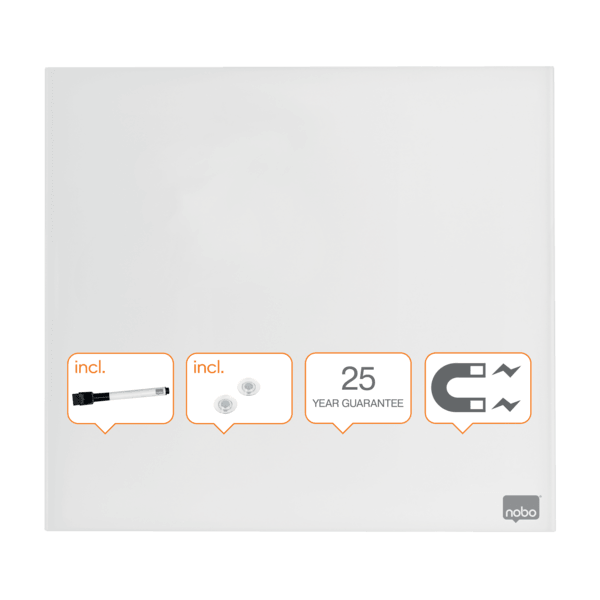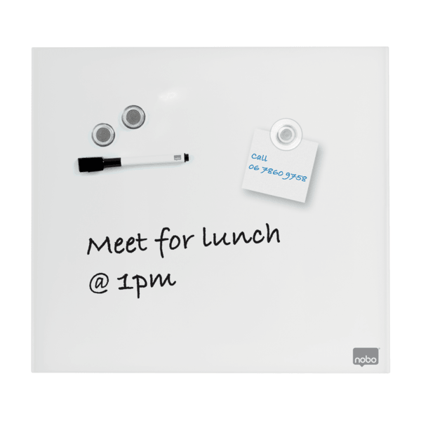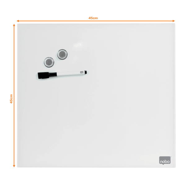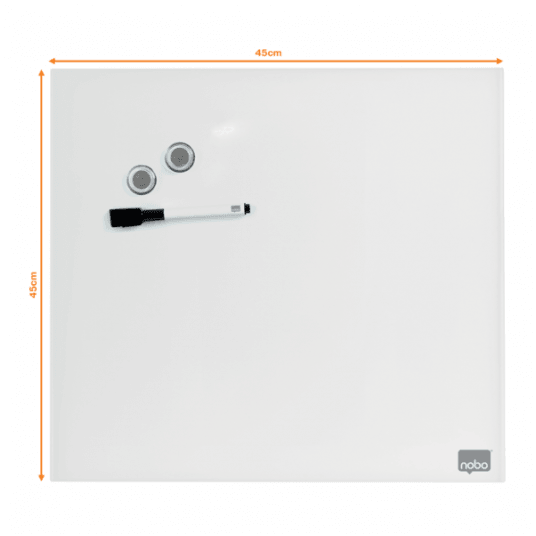 - Szklana, bezramowa tabliczka Nobo łącząca stylowe wzornictwo z funkcjonalną powierzchnią suchościeralną to doskonałe narzędzie do zapisywania notatek. - Magnetyczna szklana powierzchnia zapewnia najwyższą odporność na plamy i zadrapania, a niewielki rozmiar idealnie sprawdzi się do zapisywania notatek czy wiadomości podczas pracy w domu i w biurze. - Po prostu: zapisz coś, zetrzyj i napisz kolejną notatkę. - W zestawie z markerem. - Wymiary 450 x 450 mm.