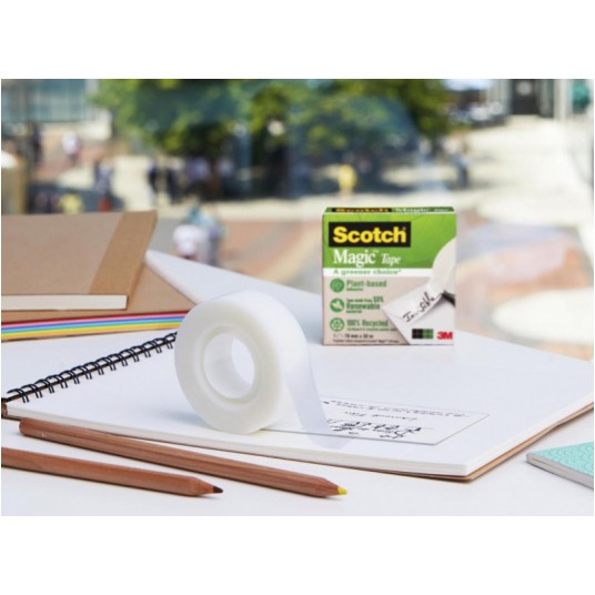 Scotch® Greener Choice to taśma Magic w przyjaznym dla środowiska wydaniu. Idealna do naprawiania i sklejania dokumentów, zaklejania kopert oraz przyklejania zdjęć i grafik. Produkt z certyfikatem OK biobased** w minimum 40% z surowców roślinnych - gwarancja najwyższej dbałości o środowisko. Klej i 53% taśmy wytworzono z surowców roślinnych, a podajnik, opakowanie i trzpień w 100% z surowców z recyklingu. Taśma z podajnikiem to idealny zestaw dla każdego, kto często korzysta z taśmy. Dzięki podajnikowi z obciążoną podstawą i metalową gilotyną, taśmę odetniesz jedną ręką. Do podajnika pasują wszystkie taśmy Scotch® o szerokości do 19 mm i długości do 33 m. Grubość: 56 mikronów, matowa folia Magic™ w 53% z surowców roślinnych, klej syntetyczny akrylowy bez rozpuszczalników na bazie roślin, Adhezja do stali 14 N/cm, Opakowanie zawiera 14 rolek taśmy Scotch® Magic™ Greener Choice, w rozmiarze 19 mm x 33 m i podajnik Scotch® C-38.