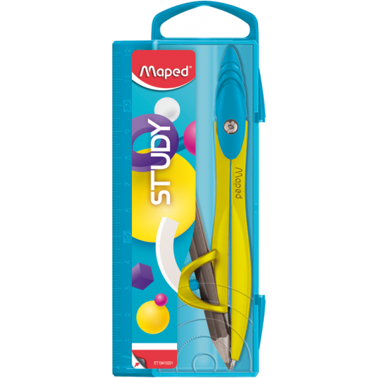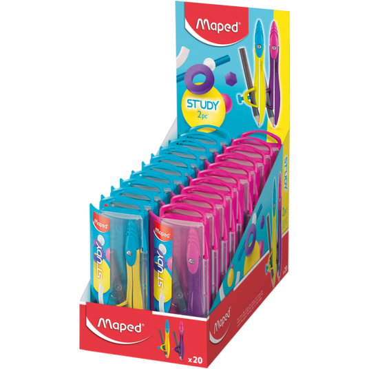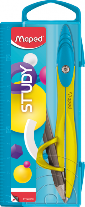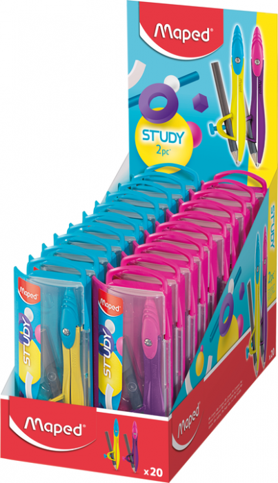 - metalowy cyrkiel z ergonomicznym uchwytem - plastikowe etui z wbudowaną linijką długości 12 cm - dostępne dwie wersje kolorystyczne: żółto-niebieski i fioletowo-różowy - w displayu mix dwóch wersji kolorystycznych