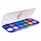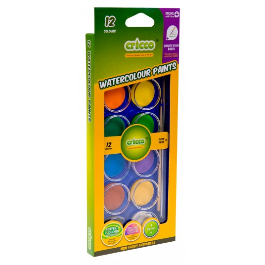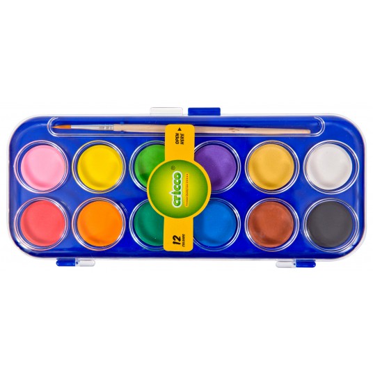 - intensywne, żywe i mocno kryjące kolory - doskonałe rozprowadzanie i mieszanie kolorów - nylonowy pędzelek w zestawie - 12 kolorów w krążkach 28 mm w plastikowej kasetce oraz zewnętrznym kartonowym opakowaniu z zawieszką