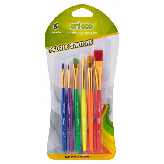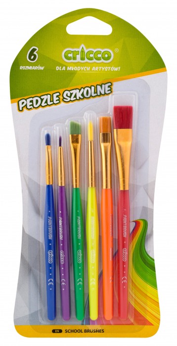 - komplet pędzelków szkolnych z kolorową akrylową rączką - zestaw dostępny jest na blistrze i zawiera 6 sztuk pędzelków o różnych rozmiarach i kształtach końcówki