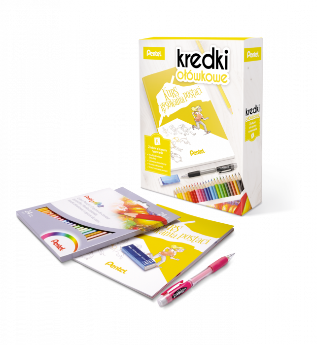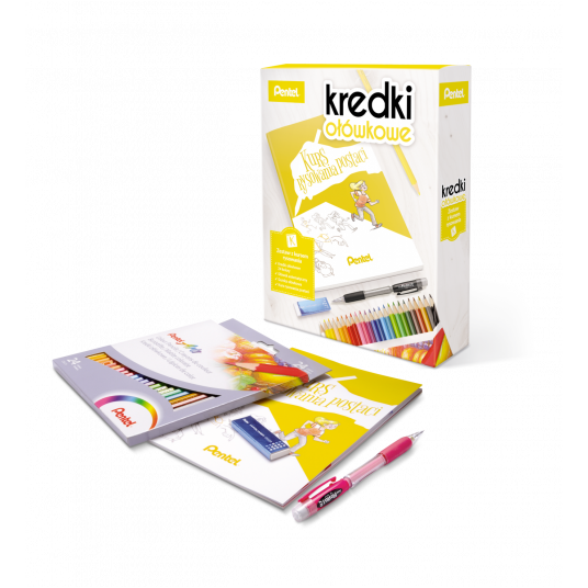 - W zestawie bogato ilustrowany kurs rysowania postaci, kredki ołówkowe 24 kolory, ołówek i gumka.