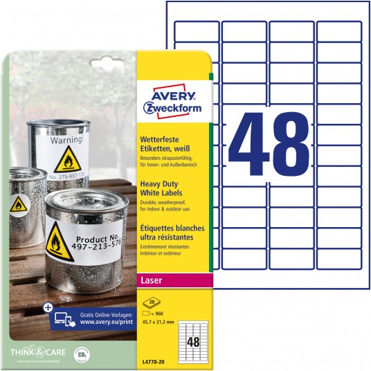 • Niezwykle wytrzymałe etykiety samoprzylepne wykonane z białego poliestru. • Wyjątkowo odporne na działanie niekorzystnych warunków otoczenia - idealne do użytku zewnętrznego. • Doskonałe do oznaczania produktów, inwentaryzacji środków trwałych, czy umieszczania informacji i komunikatów w trudnych warunkach, np.na produkcji lub budowie. • Etykiety woodoodporne, odporne na działanie smarów, brudu i temperaturę od -20°C do +80°C. • Produkcja etykiet Avery Zweckform jest neutralna pod względem emisji CO2 (certyfikat Focus Future) i zgodna ze standardem ISO14001, który pomaga zminimalizować negatywne czynniki oddziałujące na środowisko naturalne. • Przeznaczone do zadruku w drukarkach laserowych. • Darmowe i łatwe w użyciu szablony oraz oprogramowanie dostępne na www.avery-zweckform.pl