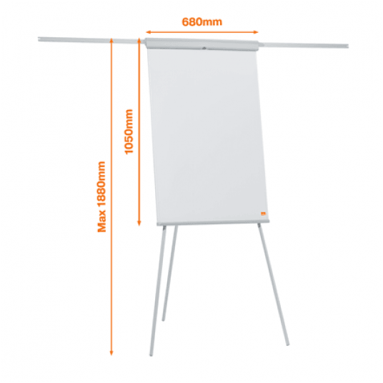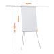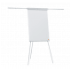 Flipchart ze stalową magnetyczną tablicą suchościeralną umieszczony na trójnożnym statywie, ze zintegrowaną półką na markery i dwoma wysuwanymi ramionami, przydatnymi, gdy trzeba pokazać dodatkowe strony.