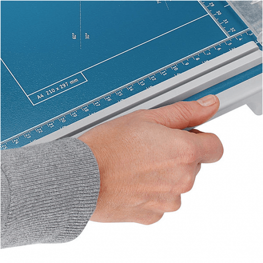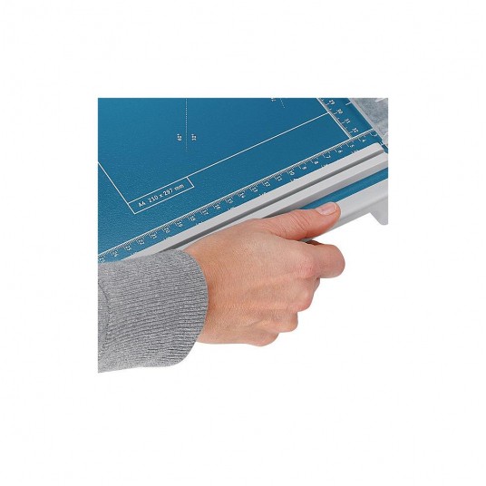 Kompaktowa gilotyna do użytku hobbystycznego. - solidna metalowa podstawa z zaokrąglonymi rogami i antypoślizgowymi nogami zapewnia stabliność - praktyczne uchwyty ułtawiają przenoszenie gilotyny - pomocne linie z podziałką w mm wzdłuż linii cięcia ułatwiają wyrównanie materiału - ergonomiczny uchwyt ostrza - górne ostrze ze stali hartowanej - dolne ostrze ze stali - ręczny docisk materiału gwarantuje położenie materiału podczas cięcia - dwie listwy ze skalą w mm do precyzyjnego cięcia 90° - długość cięcia: 320 mm - maksymalny cięty rozmiar papieru DIN: A4 - maksymalna cięta jednorazowo ilość kartek (80g/m2): 8 - maksymalna wysokość ciętego pliku: 0,8 mm - wymiary zewnętrzne blatu: 420x175 mm.