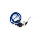 Taśma wypinająca z mechanizmem ściągającym, klipsem i zawieszką w kolorze niebieskim.