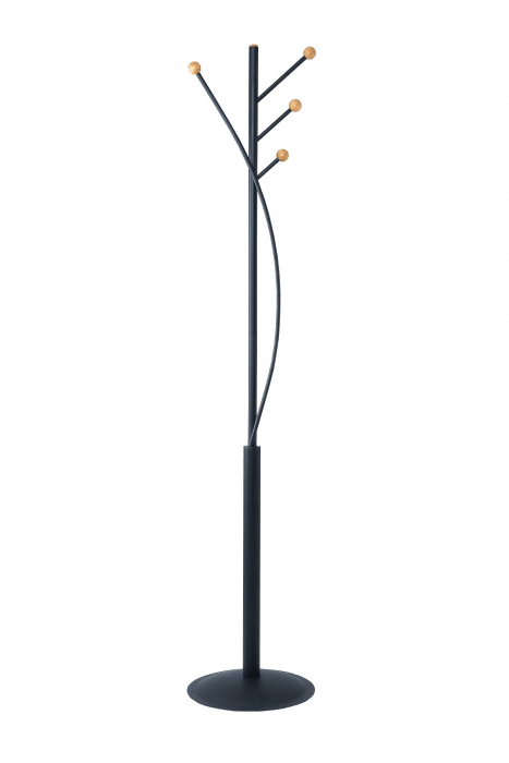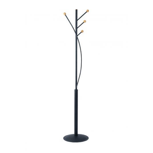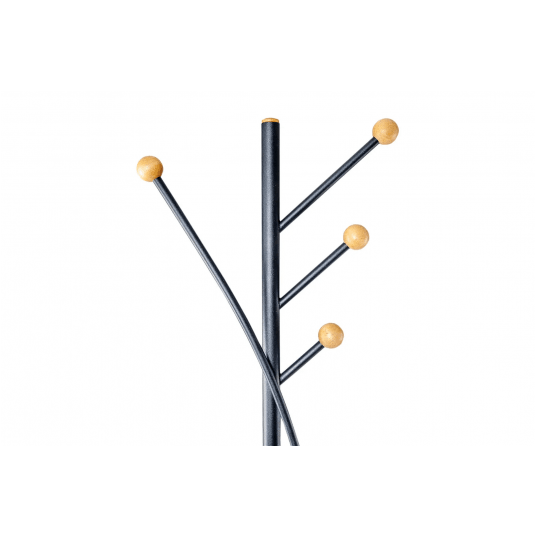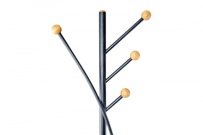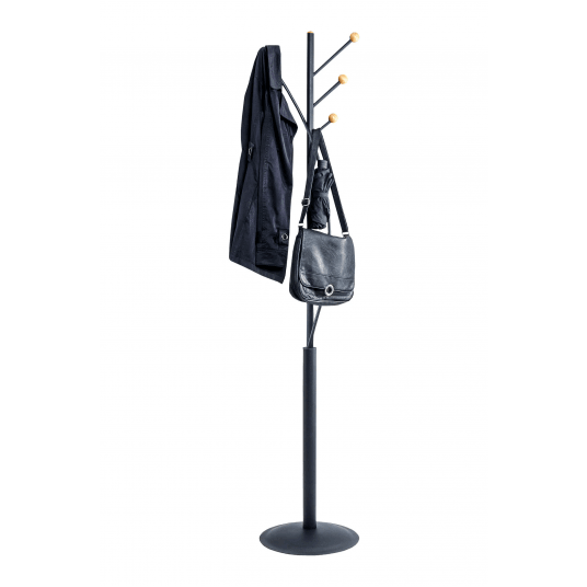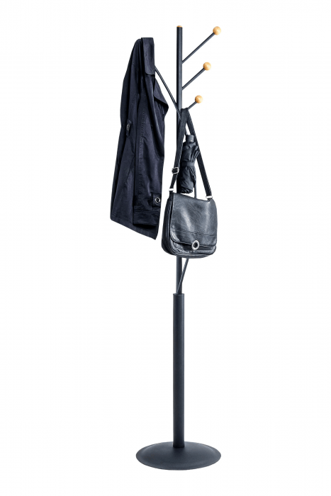 Wieszak podłogowy ze stalowym słupkiem w matowym czarnym kolorze o górnej średnicy 2,5cm, a dolnej 3 cm