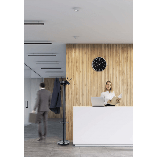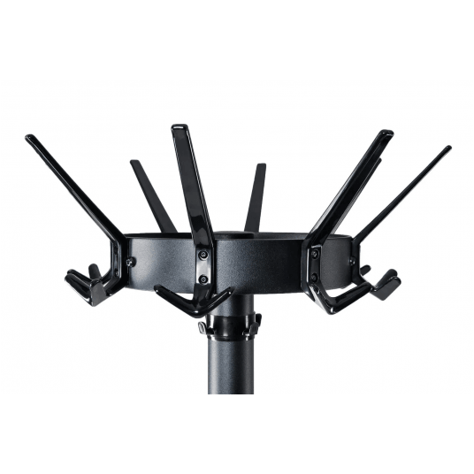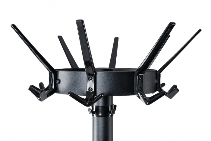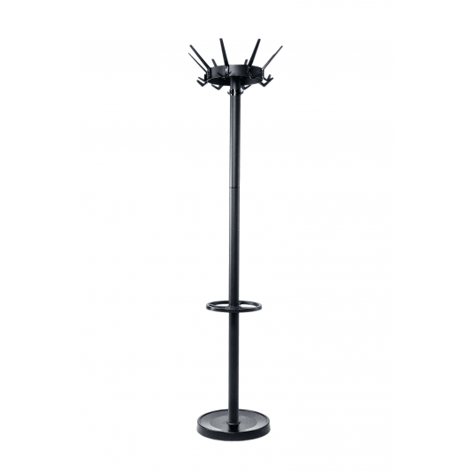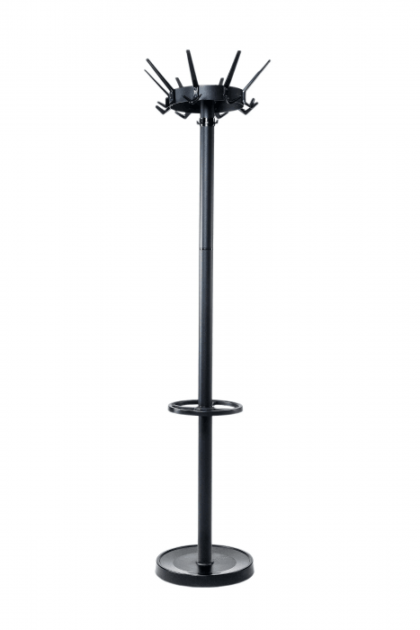 Wieszak podłogowy w kolorze czarnym z obrotową górną częścią o średnicy 46 cm.