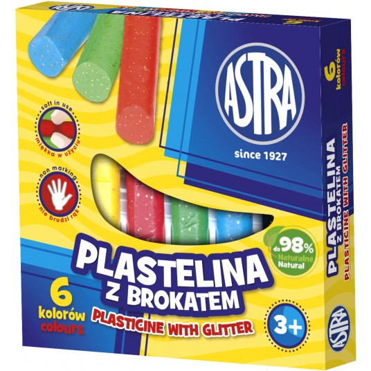 Plastelina z brokatem jest miękka i delikatna w dotyku oraz łatwa w modelowaniu. Jej kolory są niezwykle intensywne, a drobinki brokatu mienią się w świetle. Plastelina nie brudzi rąk i jest przeznaczona do wielokrotnego użytku. Doskonale sprawdzi się podczas prac plastycznych z dziećmi w przedszkolu i w szkole podstawowej. Plastelina ma właściwości terapeutyczne.