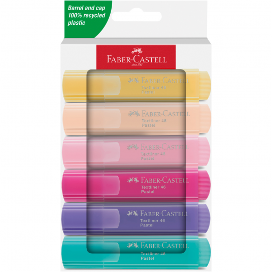 Zestaw zakreślaczy 6 szt. z tuszem na bazie wody od Faber-Castell. Tusze na bazie wody gwarantują płynne i równomierne rozprowadzanie koloru na papierze. Zakreslacze posiadają trzy różne szerokości linii (1, 2 i 5 mm), co umożliwia elastyczność w zastosowaniach i idealnie dopasowanie się do różnych potrzeb. Są idealne do użytku na wszystkich standardowych rodzajach papieru. Zarówno korpusy, jak i zakrętki zakreślaczy są wykonane w 100% z przetworzonego plastiku, co sprawia, że produkt ten jest przyjazny środowisku. Ponadto, opakowanie zestawu jest wykonane z papieru certyfikowanego przez FSC, co stanowi dodatkowy dowód na troskę o naszą planetę.