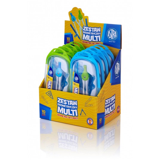 Zestaw geometryczny Astra to niezbędnik każdego ucznia. Składa się z 8 elementów zawierających metalowy cyrkiel z ergonomicznym uchwytem, ołówek, linijka 15 cm, dwie ekierki, kątomierz, temperówka, gumka.